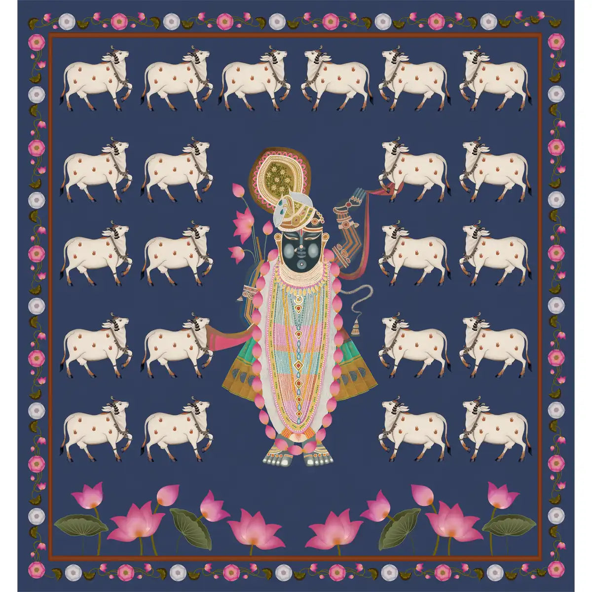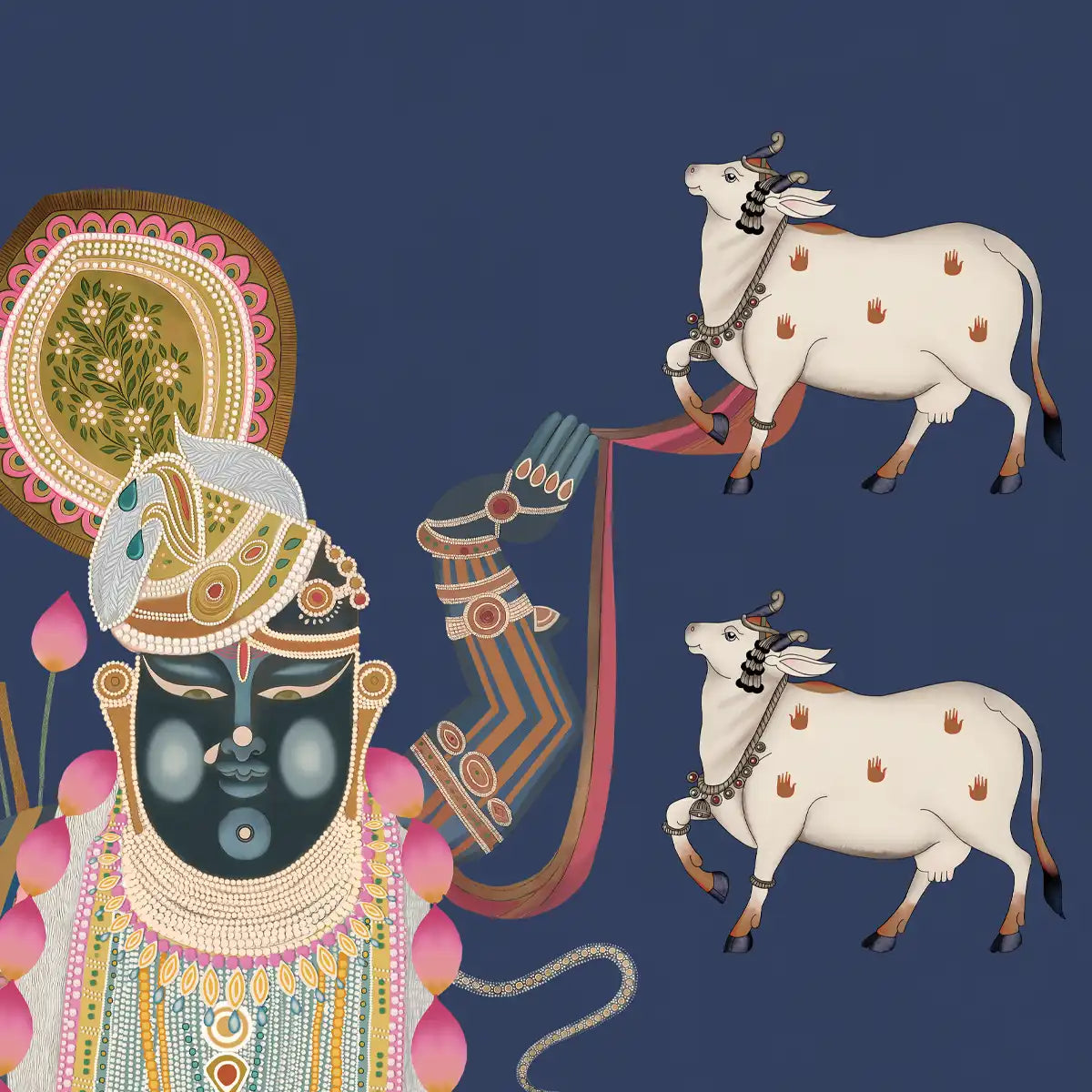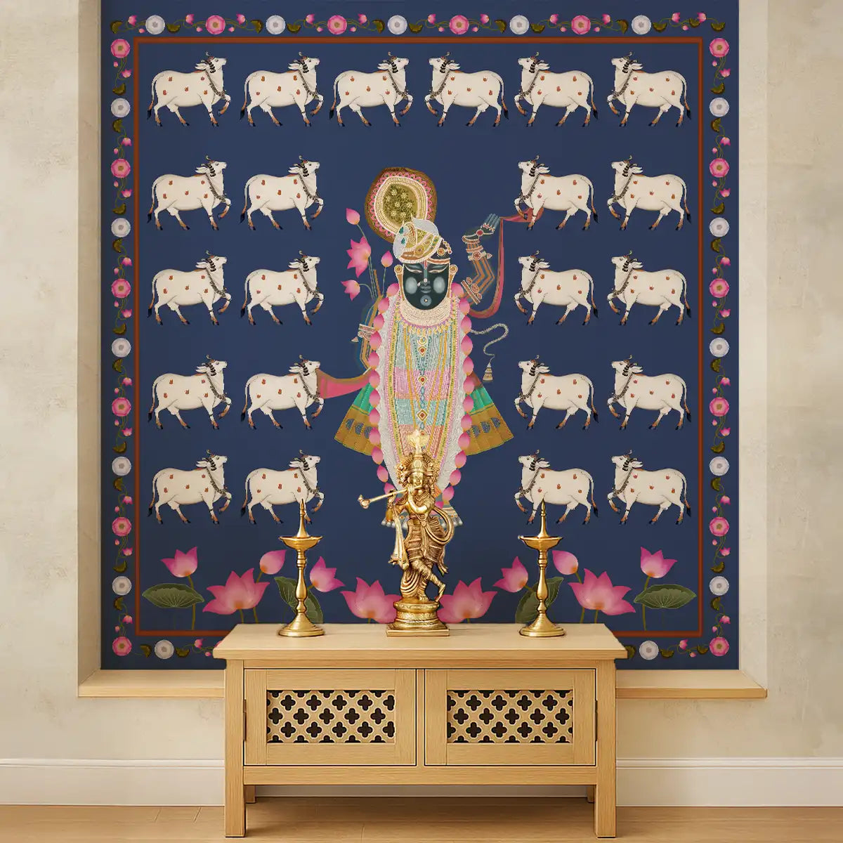 Bring spiritual serenity to your home with our Pichwai Shrinathji Pooja and Living Room Wallpaper for walls in Blue Color from Life n Color. This customised wallpaper is perfect for creating a devotional atmosphere in pooja rooms, living rooms, or any space seeking divine inspiration. P