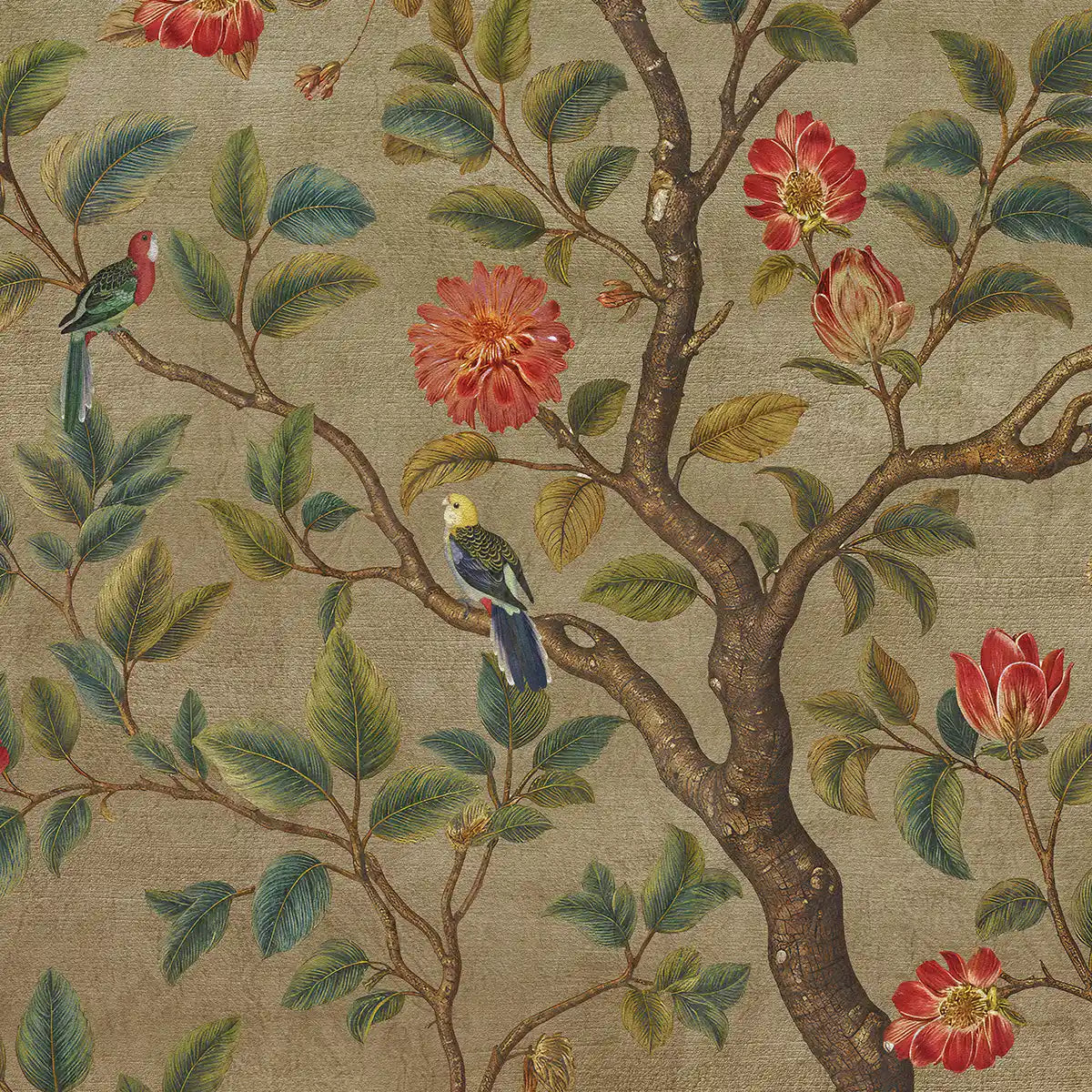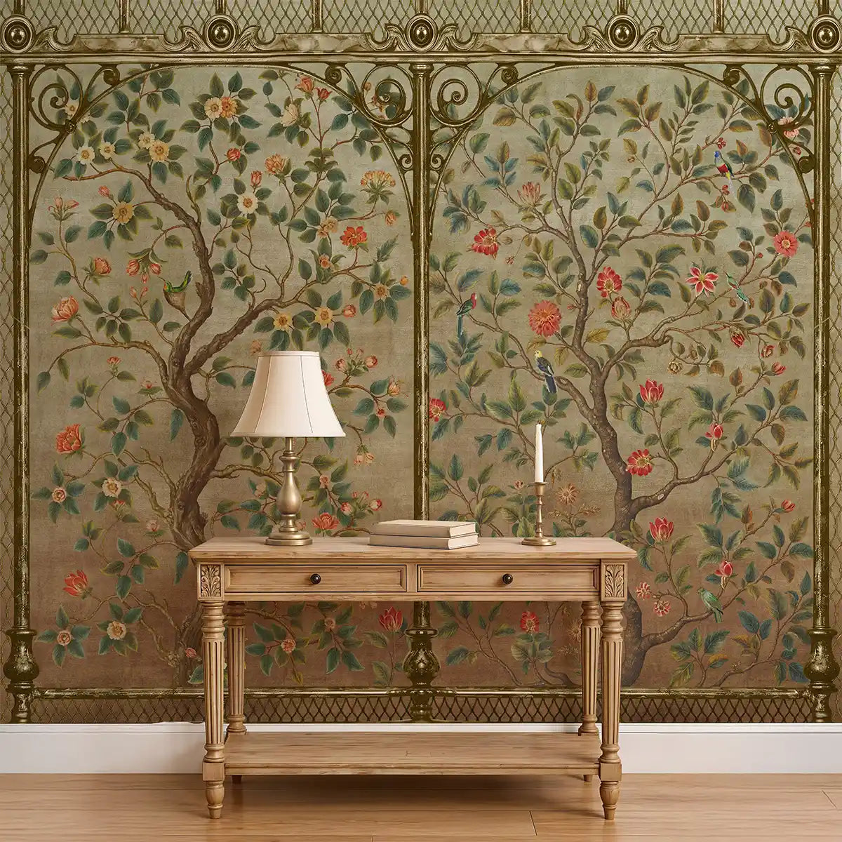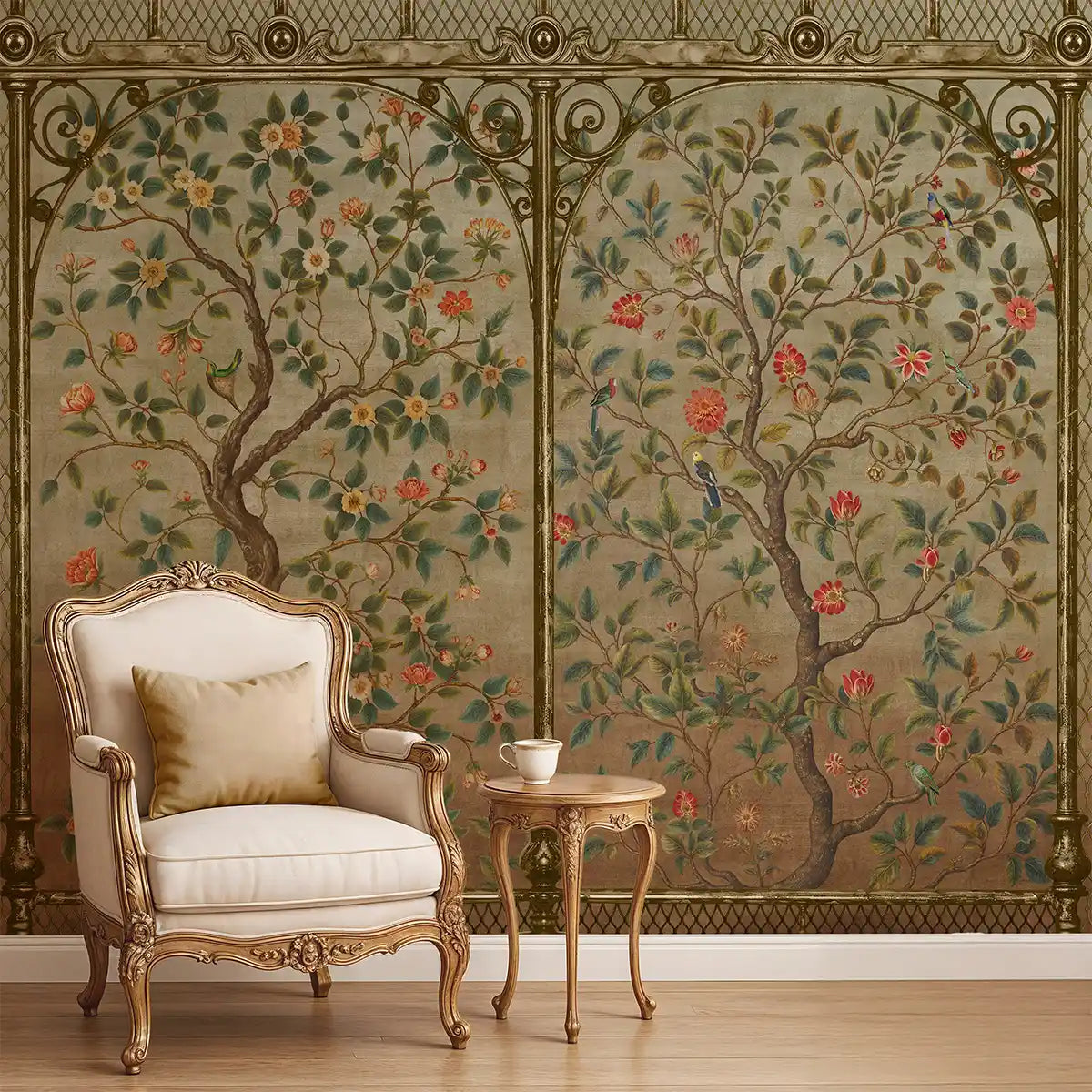 Immerse your living room or bedroom walls with our exquisite Royal Garden Chinoiserie Wallpaper from Life n Color, offering timeless elegance and a luxurious garden aesthetic. This captivating room wallpaper features intricate flowering trees and golden panels, creating a serene, sophisticated statement for any space.
