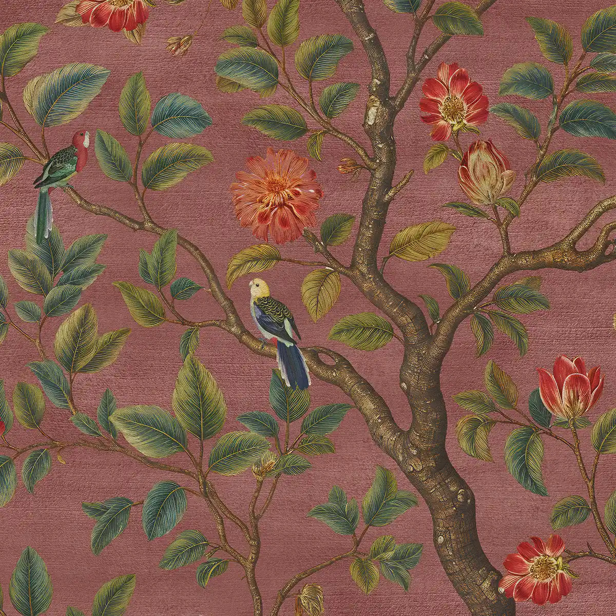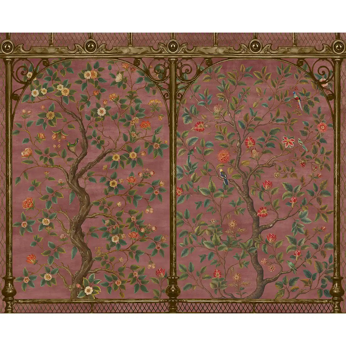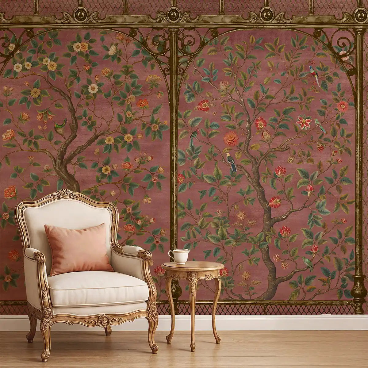 This design combines the timeless beauty of Chinoiserie artistry with a warm pink backdrop that enhances the vibrancy of floral and foliage details. Ornate borders frame the mural, giving it a regal and refined finish. Perfect for bedrooms, dining rooms, or statement walls, this wallpaper adds both luxury and a soft, romantic atmosphere to your home.