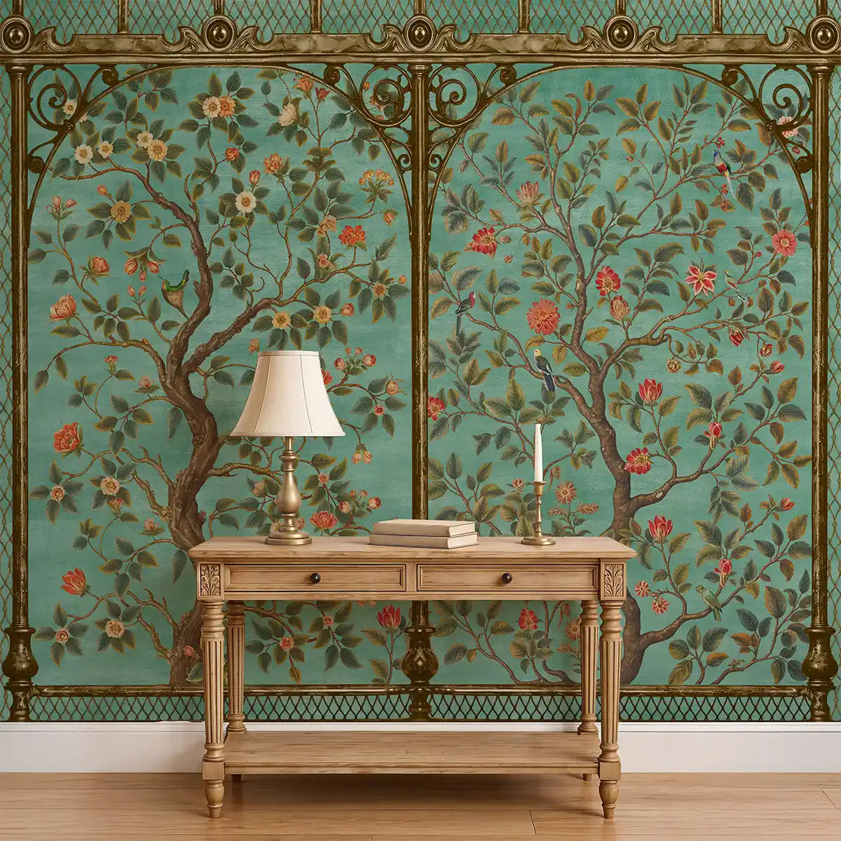 Bring bold sophistication into your interiors with our Royal Garden Chinoiserie Wallpaper in Teal. This design features flourishing tree branches, blossoms, and delicate birds framed with ornate golden borders, all set against a rich teal backdrop. The deep color highlights the elegance of the floral details, giving the mural a dramatic yet refined character. Ideal for living rooms, dining areas, or bedrooms, this wallpaper creates a luxurious statement wall with timeless Chinoiserie charm.