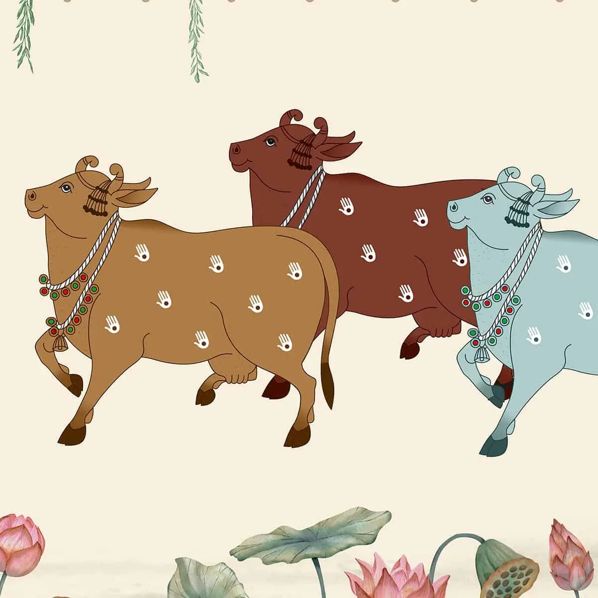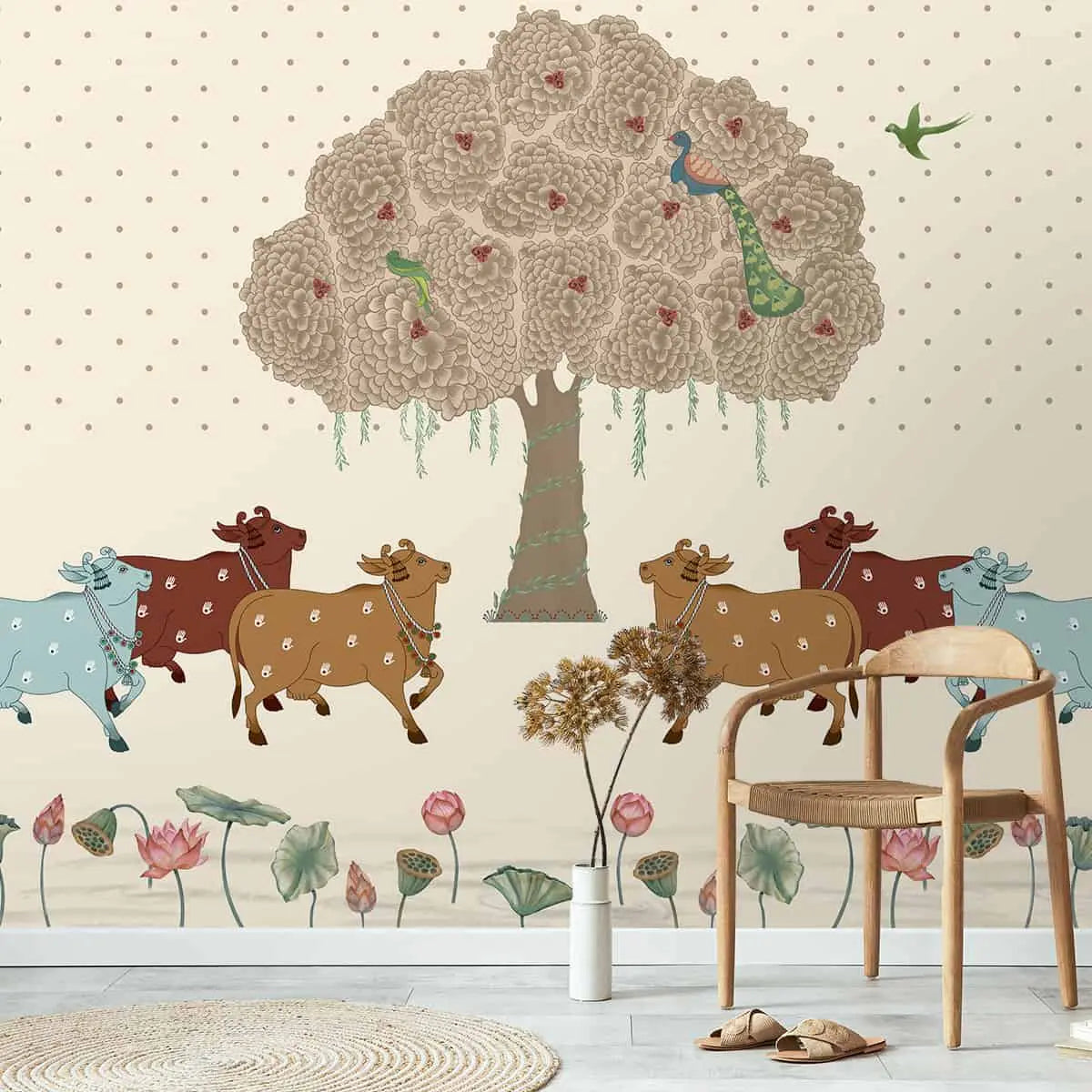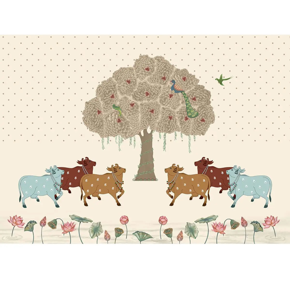 Adorn your space with the tranquil elegance of Sacred Grove Pichwai Wallpaper by Life n Colors, where serene cows grace the shade of an ancient Bodhi tree, embodying spiritual serenity.