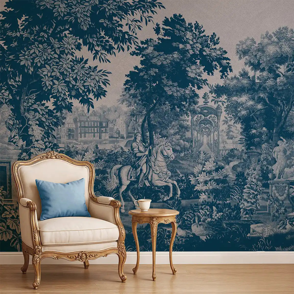 Bring old-world artistry into your interiors with our Tapestry Scenery European Wallpaper in Blue. Inspired by classic European wall tapestries, this design showcases detailed landscapes, majestic horse riders, and ornate architectural elements. The rich blue palette enhances the intricacy of the illustrations, creating a mural effect that feels both historic and sophisticated. Perfect for living rooms, dining areas, or boutique spaces, this wallpaper turns walls into timeless works of art with elegance and grandeur.