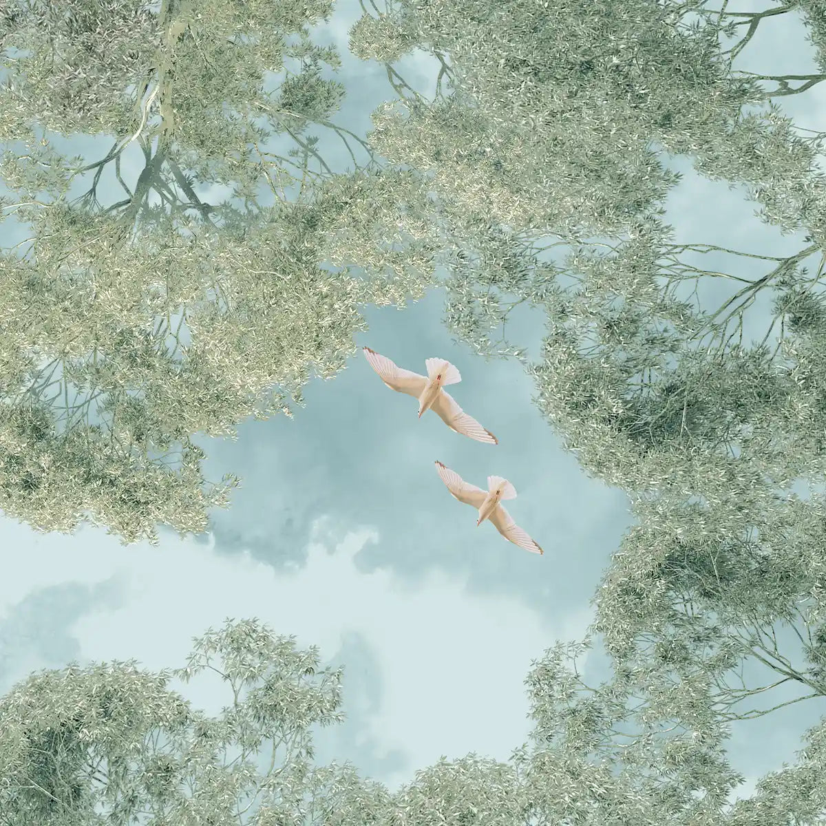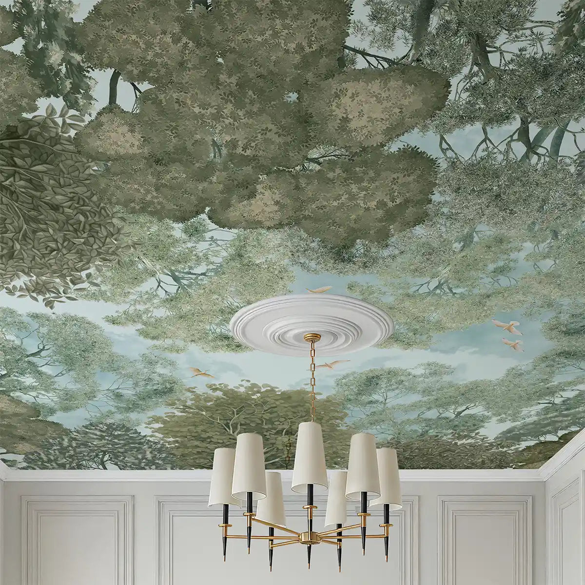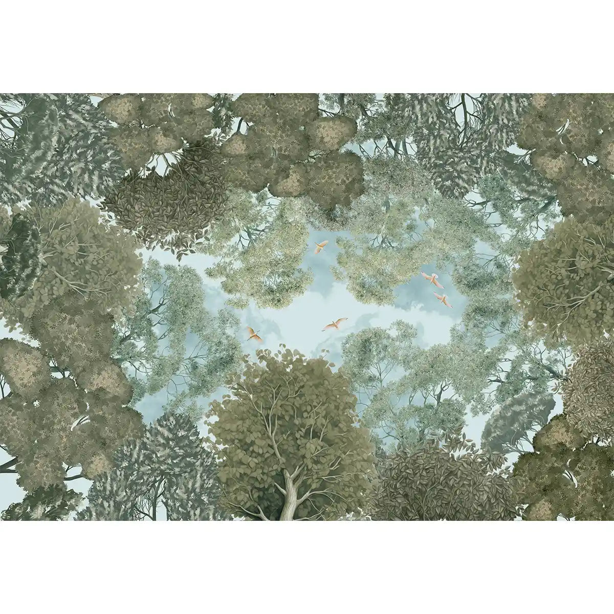 The Forest Nest in green is a nature wallpaper for ceilings and feature walls. towering treetops, dense canopy, and the beauty of a woodland seen from below. The design captures the feeling of looking up through branches at patches of sky.