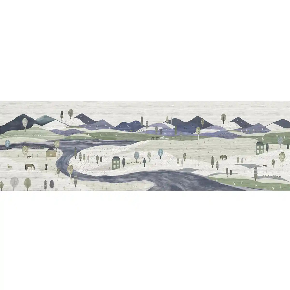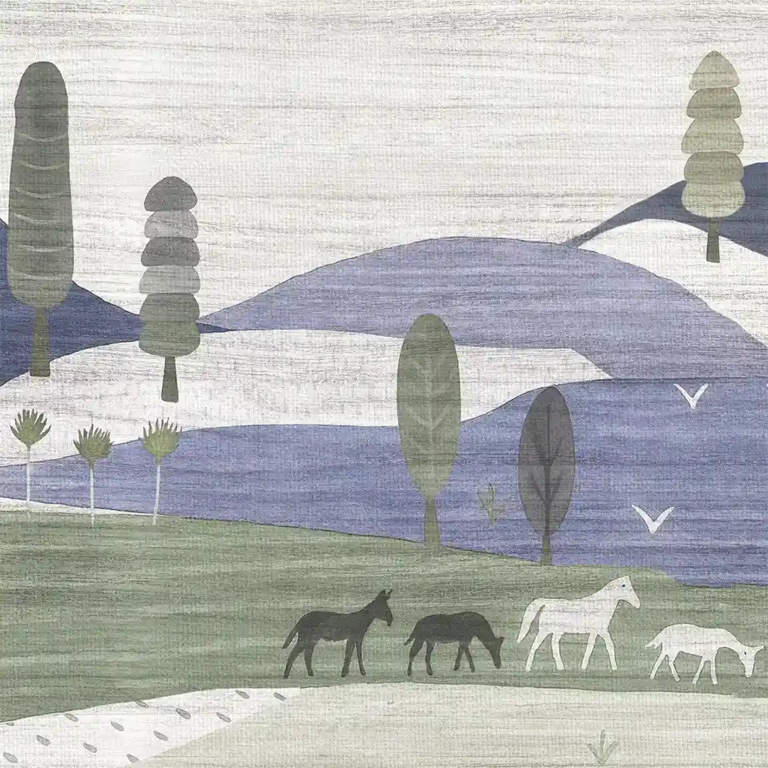 The Quilted Village mural is a heartwarming journey into a serene, storied countryside. Rendered in a sophisticated palette of Nordic Blue, Sage Green, and Soft Grey, this design features rhythmic, rolling hills adorned with "quilted" textures and patterns. Charming cottages, grazing horses, and wandering deer are nestled among stylized trees, creating a vast and peaceful landscape for a child's imagination to roam. Made in India, this high-end mural utilizes a soft, woodblock-style aesthetic that brings a grounded, artisanal energy to a modern nursery, a curated playroom, or a restorative toddler's bedroom.