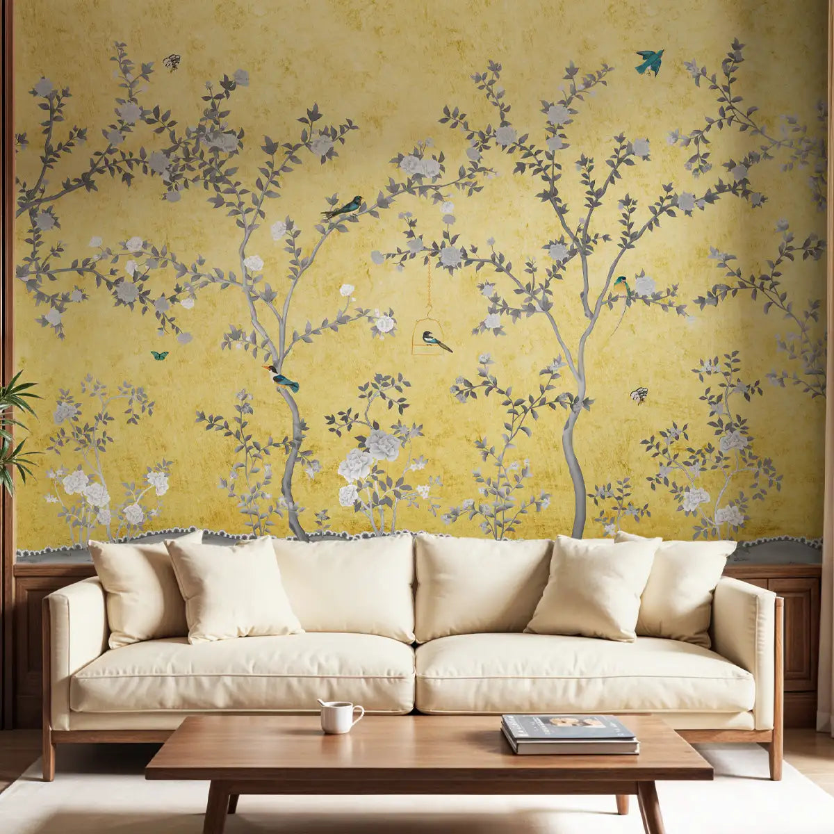 Yellow Aura in the Garden, Chinoiserie Wallcovering. Life n Colors is delighted to launch this born in China and crafted in Europe art to define your spaces! We have tried to keep the true element of this art form using flowers, animals and Chinese motifs.